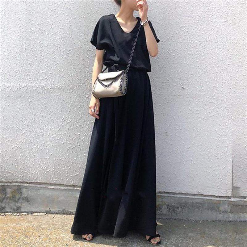 Doresuwe カジュアル半袖黒ワンピース ロング丈ゆったりソリッドカラー夏着レディースファッション カジュアルワンピース Doresuwe Com